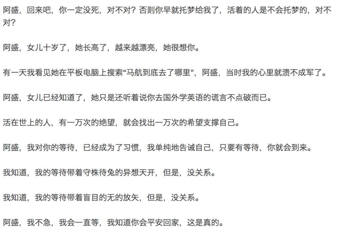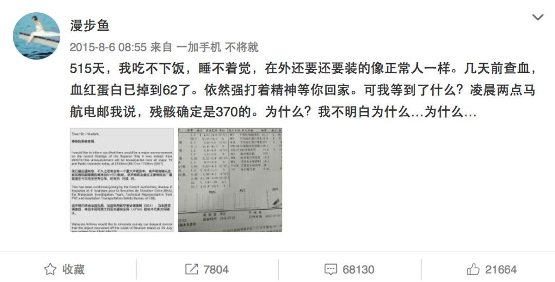 2015年8月,515天,我吃不下饭,睡不着觉,在外还要还要装的像正常人一样。几天前查血,血红蛋白已掉到62了。依然强打着精神等你回家。可我等到了什么?凌晨两点马航电邮我说,残骸确定是370的。为什么?我不明白为什么…为什么…