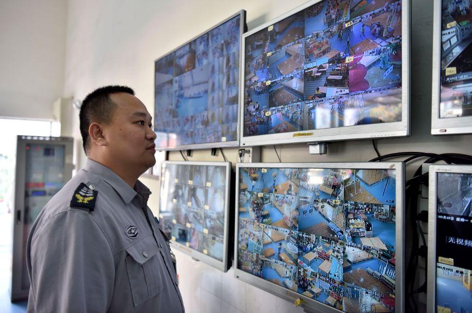 郭建华在幼儿园监控室里看监控录像(大图),热心工作的他赢得师生和家长们的一致好评。