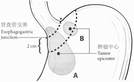 肿瘤侵犯胃食管结合部但中心位于胃食管交界线以下2cm以外区域(A)或肿瘤中心位于胃食管交界线以下2 cm以内,但肿瘤未侵及胃食管交界线(B)应按照胃癌标准进行分期。