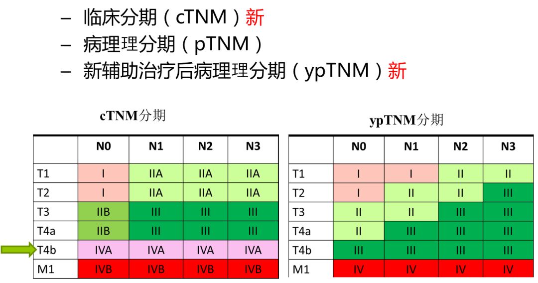 除了病理分期(pTNM),增加治疗前的临床分期(cTNM),以及新辅助治疗后病理分期(ypTNM)。