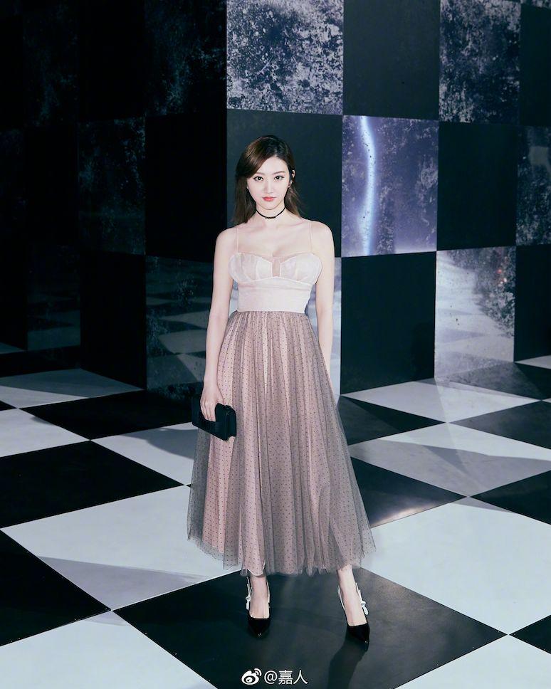 景甜一袭裸粉色长裙搭配齐肩直发,大展淑女魅力。