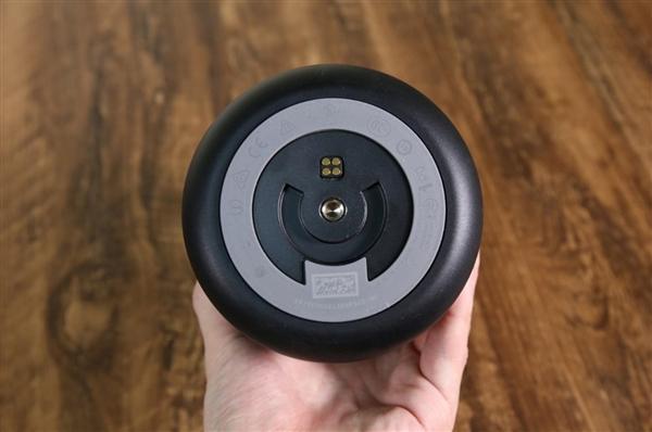 BOSE SoundLink Revolve+机身底部,排列着充电针脚与1/4螺口,支持底座充电,也方便使用三脚架架起音箱,提高音源位置的同时,还能防止与桌面共振造成的混响。