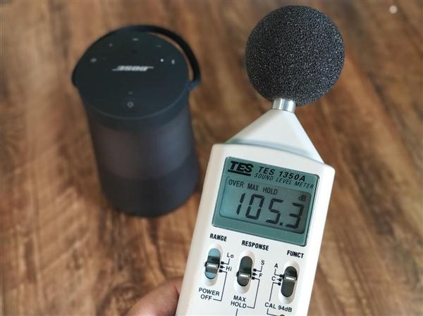 超过100分贝的最大音量让笔者在拍照时险些崩溃,而且就体验而言,最大音量下BOSE SoundLink Revolve+的表现要比一般音箱的100分贝更加震撼,地板都随之震动,你甚至能感受到声浪的存在。