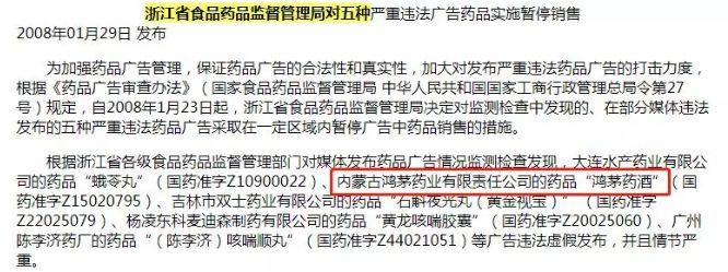 在过去 10 年间,据不完全统计,鸿茅药酒广告曾被江苏、辽宁、山西、湖北等 25 个省市级食药监部门通报违法,违法次数达 2630 次,被暂停销售数十次。