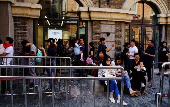 图为国庆黄金周期间,汉街小米旗舰店外,市民排起了长龙。记者何晓刚 摄