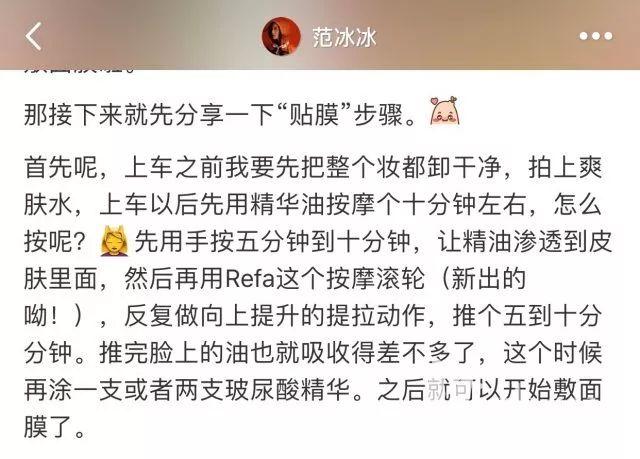 范冰冰自己写的是用精油按摩5-10分钟后再拿这个ReFa的美容仪去做向上提拉的动作,5-10分钟哦~