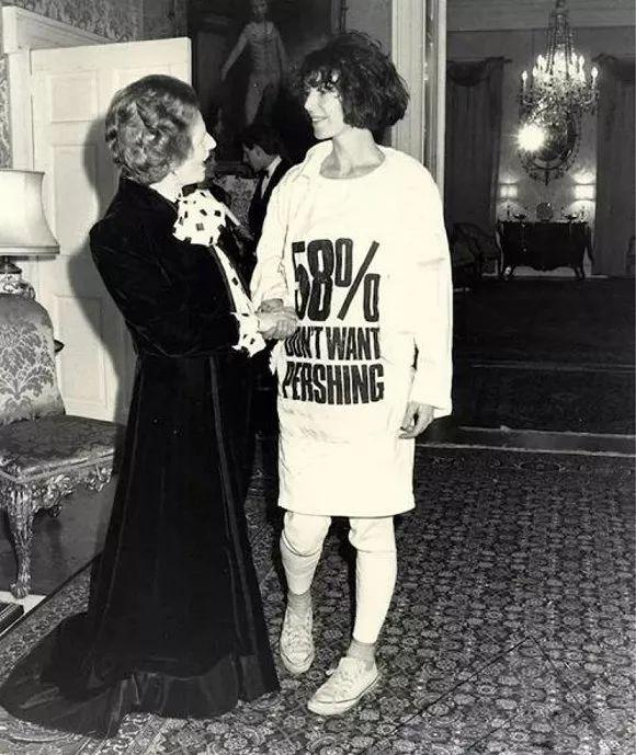 1970年代,时装界的“朋克之母”、英国设计师Vivienne Westwood和她的合作伙伴Malcolm McLaren生产了一些印有包括“revolution”之类的政治口号T恤。过了几年,英国设计师Katharine Hamnett在接受最佳设计师的颁奖时,穿着引有“58% Don’t Want Pershing(58%的英国人不想要导弹)”的衣服面见了撒切尔夫人,表达了自己的反战态度。从那时起,人们才发现,原来时尚也可以和政治有所关联,时装是表达态度和观点的有力*器武**。