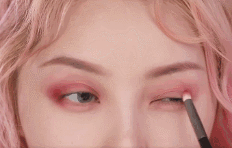 然后使用圆头眼影刷,选择颜色较深的玫红色加深眼头和上眼尾以及下眼尾,增强眼睛立体感和颜色的层次感。