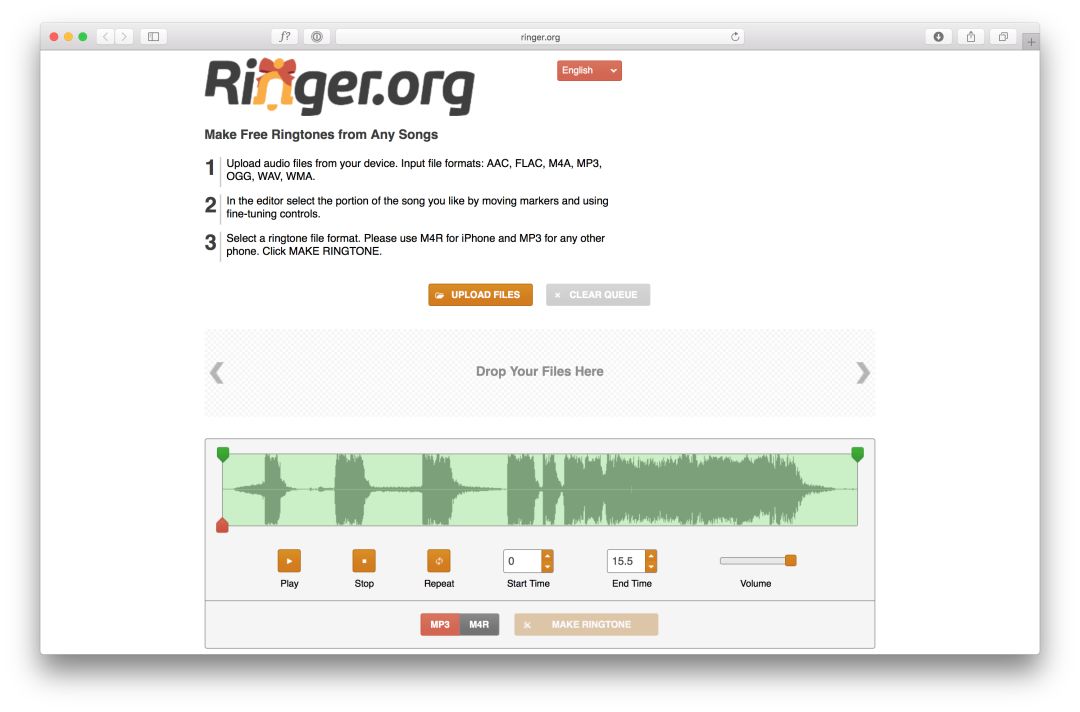 手机的铃声是不是从来没有更换过,可能是因为制作铃声的方法有那么点复杂,一步步的操作加上各式软件,或许就让你放弃了这个念头。其实,你只需要把各类格式的音乐源文件上传到Ringer 上,选择选上铃声的开头结尾。最后选择 M4R 或是 MP3 就可以了,可以说是免费又快捷了。