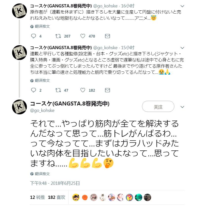 动画《GANGSTA.》制作当时,コースケ一边不能耽误连载,一边还要监修设定、台本、周边,要为圆盘封套、购入特典、漫画、周边之类创作新图。原本就体质虚弱、笔速缓慢的她,中途就身心俱惫,卧床不起。能坚持到最后的原作者们,真的是靠笔速、处理能力和肌肉撑过去的。