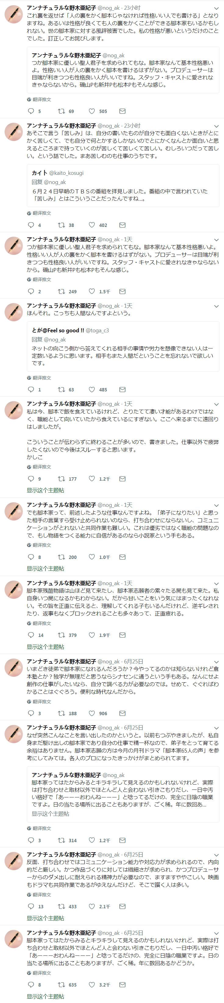 编剧野木亚纪子说,脚本家这个职业,在外人眼里可能光芒万丈,但实际上除了开会和取材之外基本上一年到头都不和人见面锁在家里写稿,一整天蓬头垢面念叨“啊——写不完啊——”,完全是见不得光的职业。虽然偶尔也会被晒到太阳下面,但那非常罕见,一年也就只有几次。