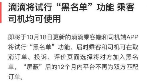 滴滴将试行“黑名单”功能,乘客司机拉黑对方后1年内不会匹配。