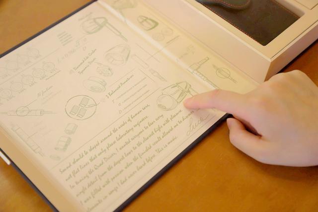 翻开包装后,左侧是以浅浅的杏色为背景色的手绘风格的耳机设计草稿,右侧是耳机与配件。