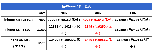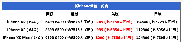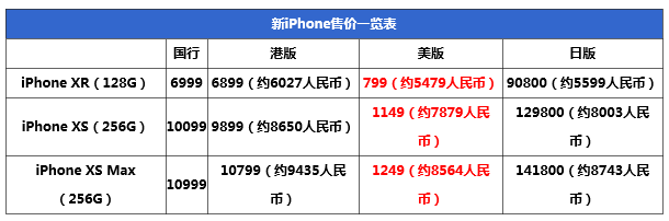 苹果iPhone XR/XS Max全球售价对比