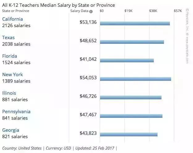 全美各地 K12 老师的薪资中位数▼