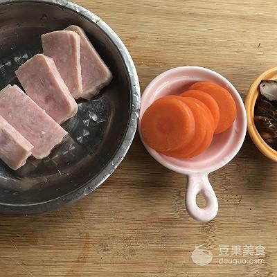3、午餐肉切好,胡萝卜切片,香菇去蒂切片。