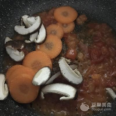 10、把胡萝卜片,香菇片倒入翻炒。