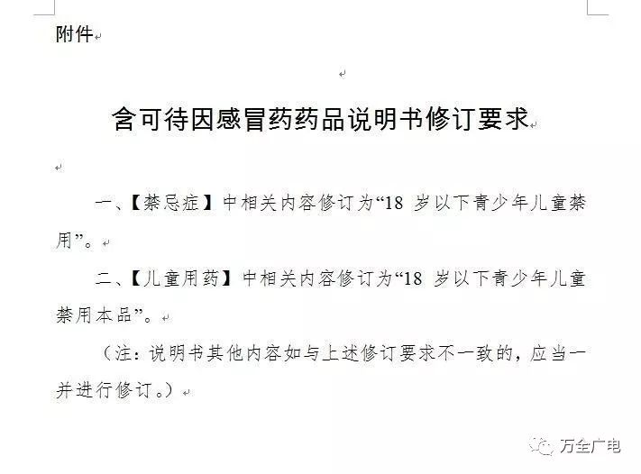 公告要求,对含可待因感冒药药品说明书进行修订:将“禁忌症”及“儿童用药”中相关内容均修订为“18岁以下青少年儿童禁用本品”。