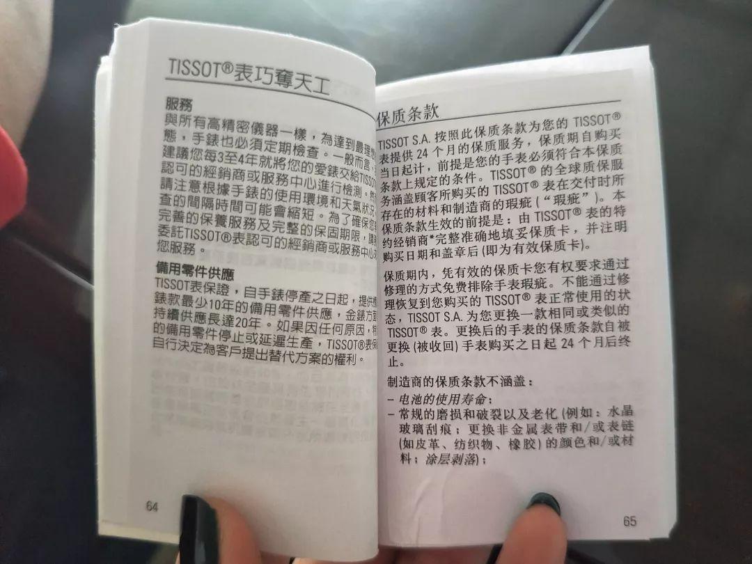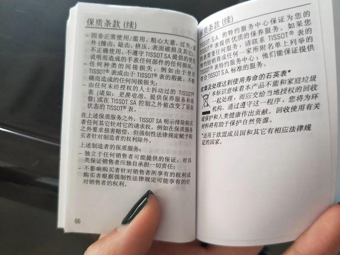 工作人员给记者拿来了一份天梭手表的质保说明书,上面对于出现质量保证有着明确的解释。