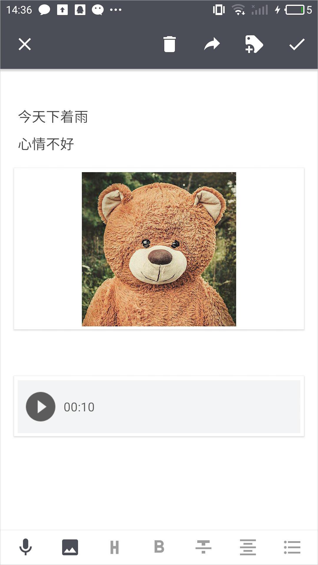 针对于文本的编辑,提供了标题的样式,以及加粗,划线文字,剧中显示以及列表形式。虽然不是特别多,但是对于我们这种随笔记录的小清新来说是足够的。