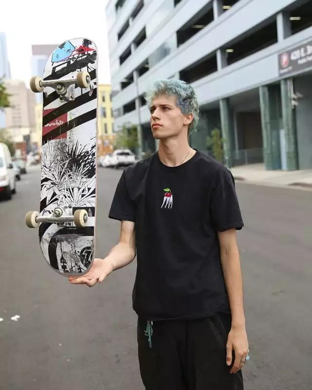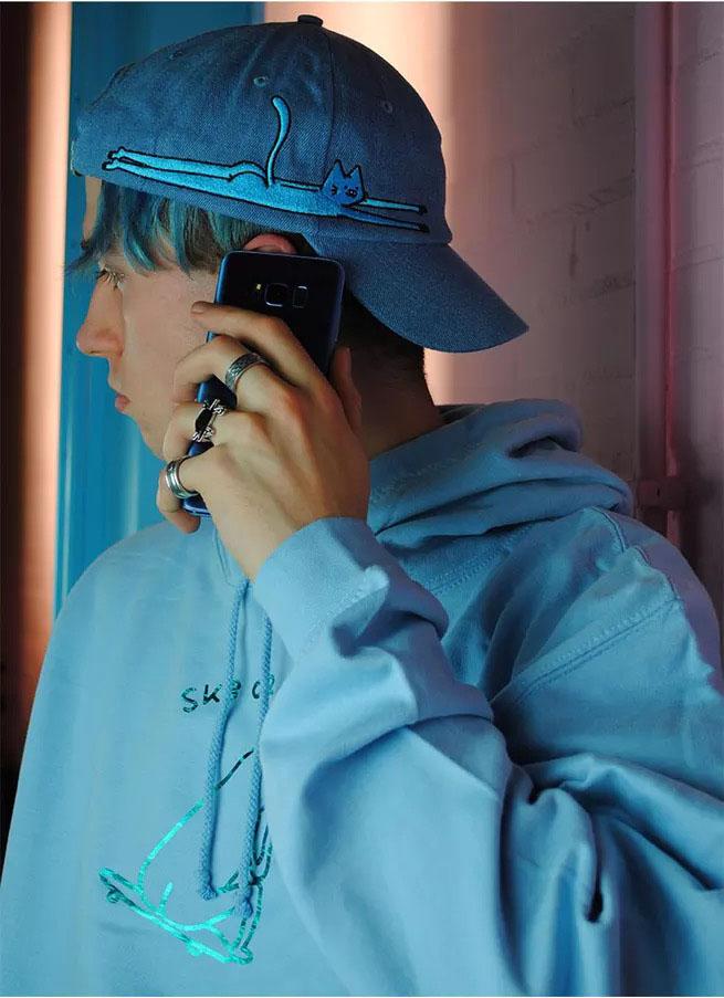“蓝污猫”品牌完全符合现下年轻人爱搞笑爱创意的标准。可能因为长得帅,因此不止是他的滑板,就连他的配饰和服装就俘获了大批粉丝。