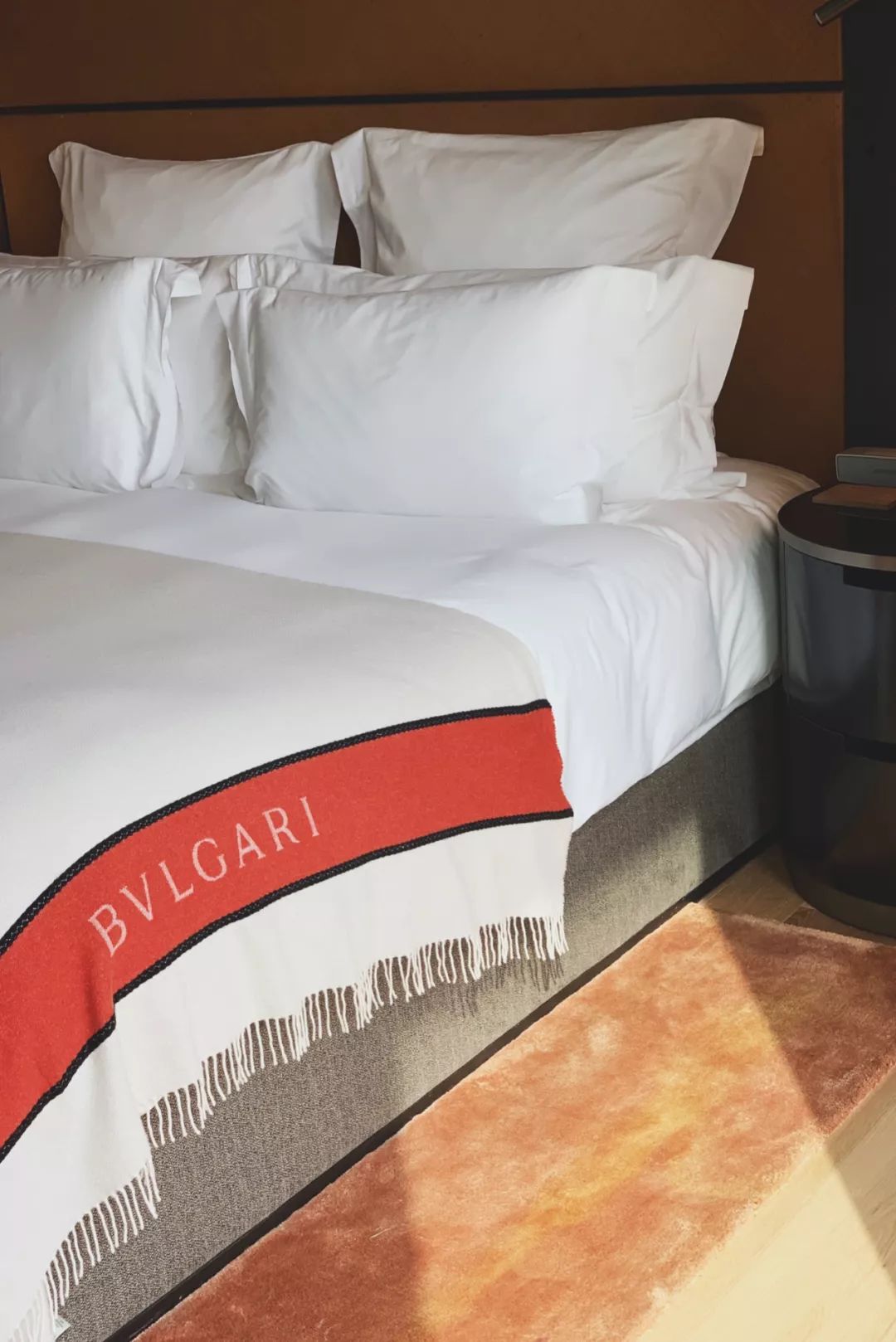 还没来得及享受甜品,目光就被床铺上的宝格丽羊毛毯吸引。