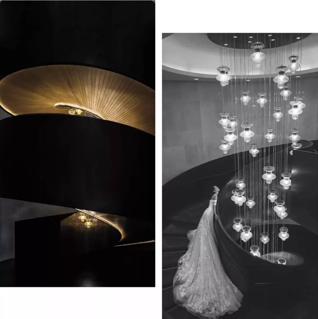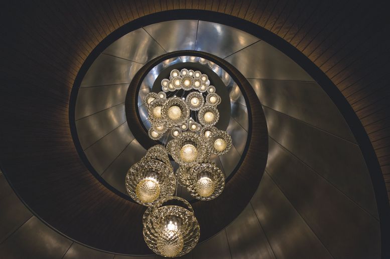 在旋转楼梯的上方是定制的 Barovier & Toso手工吹制水晶吊灯,延续了宝格丽一款知名蛇形珠宝Serpenti的灵感,楼梯的内部还配有精致的金箔装饰。