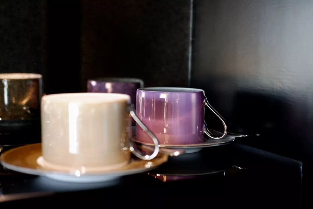 迷你吧一旁的咖啡杯也是格外华丽,是由来自伦敦的手工玻璃与瓷器品牌 LSA出品的POLKA咖啡杯。