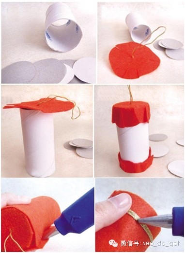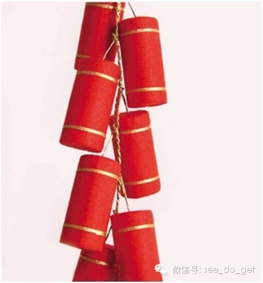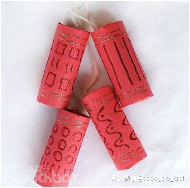 虽然现在很多城市禁放鞭炮了,但是这个节日怎能少得了它,将家里不用的卫生纸芯改造成一串鞭炮,挂在家里,很有喜庆的气氛啊,材料可以选择红色卡纸或红色不织布。