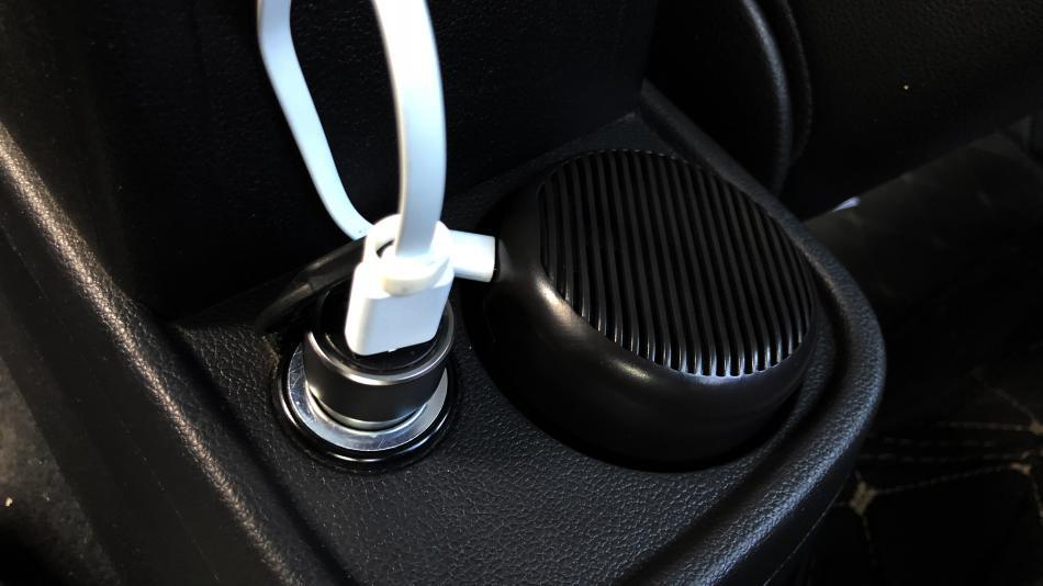 另外,它的电池设计为圆形,所以我们平时充电的时候可以用车载USB进行充电。它刚刚好放在水杯支架里,这一点非常赞。