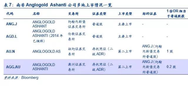 南非的Anglogold Ashanti,最早于南非约翰内斯堡上市(J S E:A N G) ,以开采南非金矿为主,目前已为跨国矿业公司。在纽交所(N Y S E)上市和澳交所(A S X:A G G)上市发行存托凭证外,其还在伦交所(LSE)上市。其中,在纽交所和澳交所发行的存托凭证的代表证券为约翰内斯堡证券交易所发行的普通股。