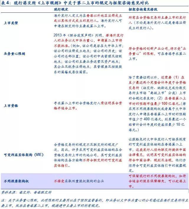 港交所近日公布的《新兴及创新产业公司上市制度咨询文件》中拓宽上市制度主要为了吸引高素质及高增长的创新产业公司(包括已在其他地方上市的公司)来港上市。和现行的《上市规则》相比,在上市类型、地域限制、上市资格、不同投票权架构和可变利益实体架构(VIE)等方面都做了改变。