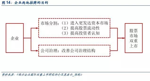 借鉴国际经验,两地挂牌并非新鲜事。通常,企业选择两地挂牌的目的主要有两个层面,一是为了进入更发达的资本市场,提高其流动性、估值以及投资者认知;二是为了改善公司的治理结构,对于本国资本市场不发达的企业,特别是新兴市场,通过双重上市,接受更严格的监管、更透明的信息披露,从而达到改善公司治理结构的目的。