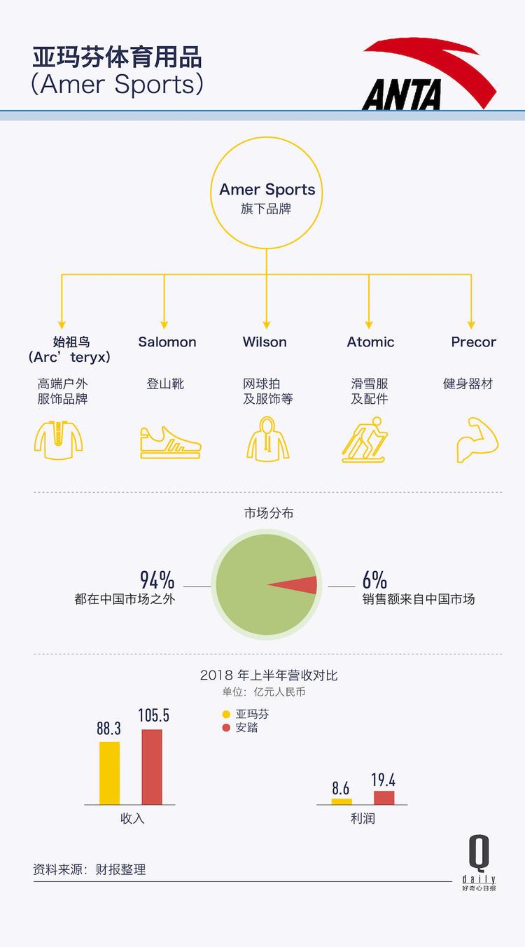 2018 年上半年,Amer 总收入为 11.07 亿欧元(约合 88.3 亿元人民币),排除汇率影响后利润为 1.08 亿欧元(约合 8.6 亿元人民币)。同期,安踏收入为105.5 亿元人民币,净利润为 19.4 亿元。