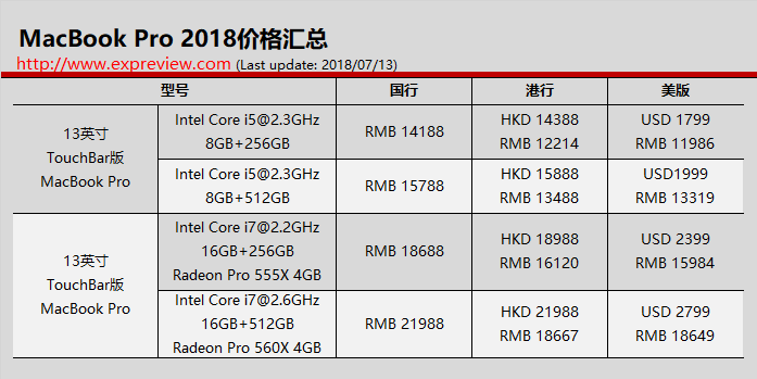 尽管苹果在全球官网同步更新了2018版MacBook Pro的信息,但上市时间并不是同步的,要看产品是否已经通过该国家/地区必要的法律法规认证。就比如说中国还在等待批准才能够上架销售,不过在中国香港已经全面开卖,最快可以在7月18日拿到手。这里我们汇总了中国区、香港区、美国区2018版MacBook Pro的价格信息,供大家参考对比。同时我们发现皇帝顶配版MacBook Pro售价高达52408港元,换算成人民币也就是4.45万元,史上最贵的MacBook Pro就此诞生。