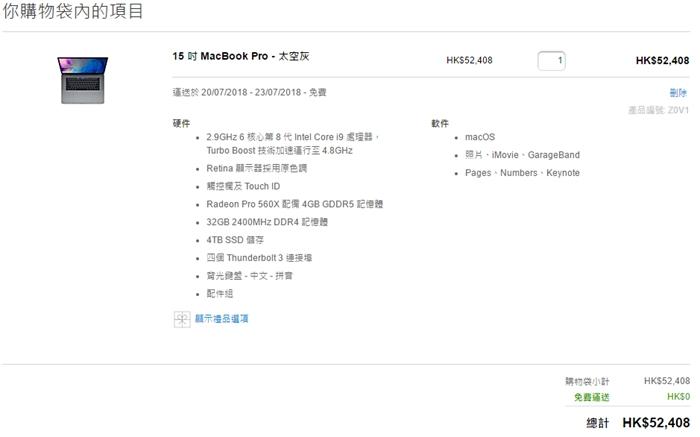港行2018版MacBook Pro如果选择今天下单的话,无论是13英寸还是15英寸,最快能在7月18日拿到,不晚于7月20日。