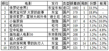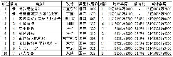 上周末7月14日至15日,日本电影市场观影人次前十位的影片,及各自票房收入状况一览: