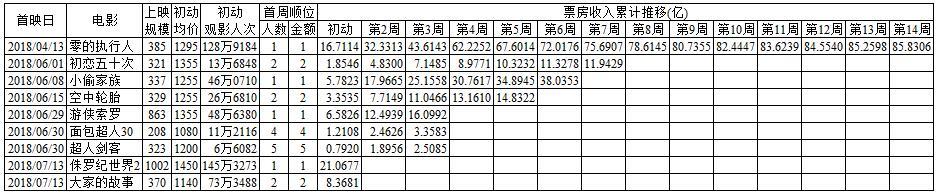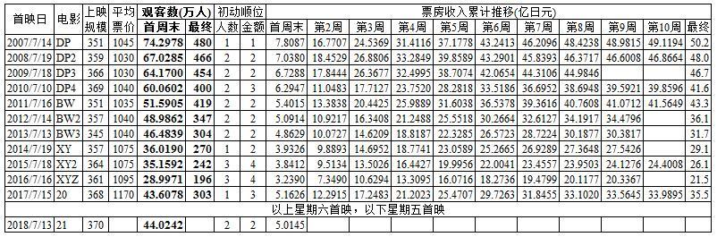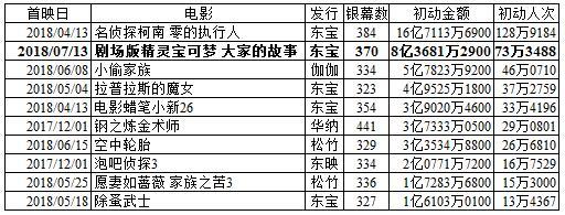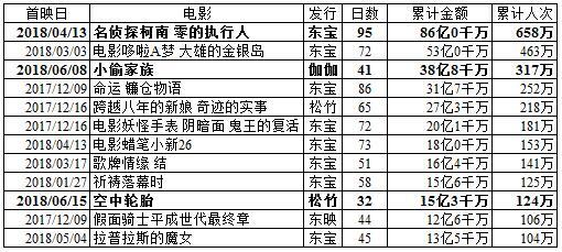 注:《面包超人》和《超人剑客》初动为双休日的2日间,《侏罗纪世界2》和《剧场版精灵宝可梦 大家的故事》初动为星期五到星期一的4日间,其他初动为星期五到星期日的3日间。