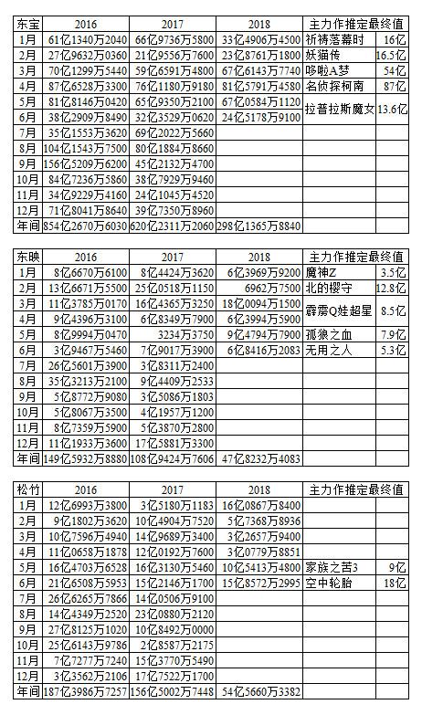 注:最右列推定最终值是未然状态的数字,已然的实绩累计值进展见前表,最终上映结束后的实绩值最晚最晚可能等到翌年3月初统一发布年度决算电影的票房收入,不是发行公司的营业收入,这类数字见各公司财报;也不是公司发行电影所得的收入,这类数字2000年度起不再公开。