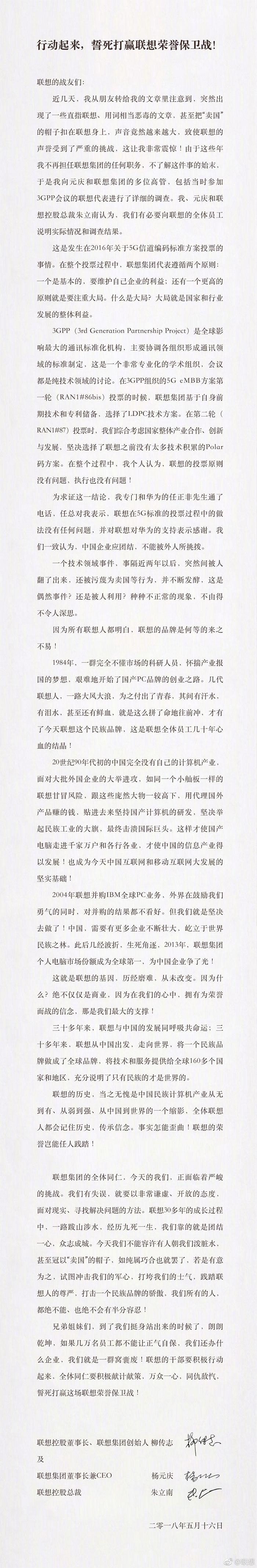 最近一段时间联想公司被香港踢出恒生指数,不仅股价下跌,还面临着一个更大的争议——联想在5G标准中投票是否*国卖**的问题,在高通与华为争夺5G长短码的投票中,联想被人抓住了短码投票支持高通致使中国痛失5G一大标准的问题。此事已经严重影响了联想的声誉,官方此前已经多次回应过这个问题,今天联想三大高管——创始人柳传志、董事长、CEO杨元庆、总裁朱立南再次刊文回应5G投票问题,认为联想要维护自己的利益,也注重大局,投票并没有问题。