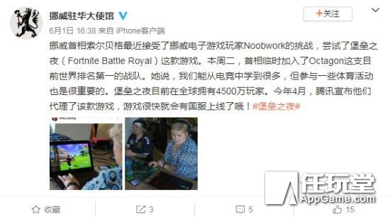 【趣闻】挪威女首相成堡垒“新代言人”,上手试玩还有官方微博宣传