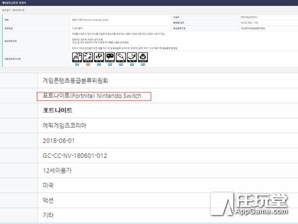 自《堡垒之夜》爆红之后,业界一直有传它将登陆各大平台的消息,但始终真假难辨,最近又有可靠消息指出《堡垒之夜》将登陆任天堂Switch。在韩国分级网站上显示,韩国分级委员会近日通过了对《堡垒之夜》任天堂Switch版的审核,我们可以清晰地见到上头标示出来的“Fortnite”和“Nintendo Switch”等关键字样。