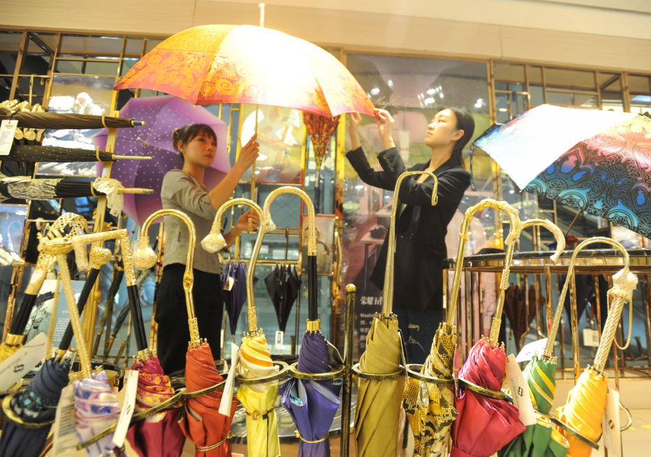5月9日,武汉解放大道一商场里,各款造型别致的奢华雨伞吸引市民驻足打量。记者 苗剑 摄