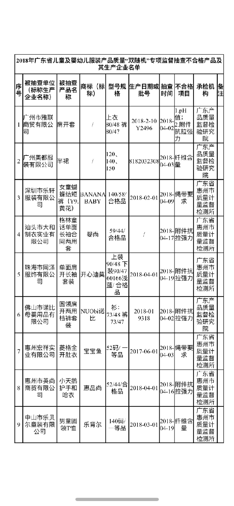 数据显示,本次共抽查广东省内99家企业生产的99批儿童及婴幼儿服装产品,经检验,发现9家企业生产的9批次产品不合格,不合格产品发现率为9.1%。