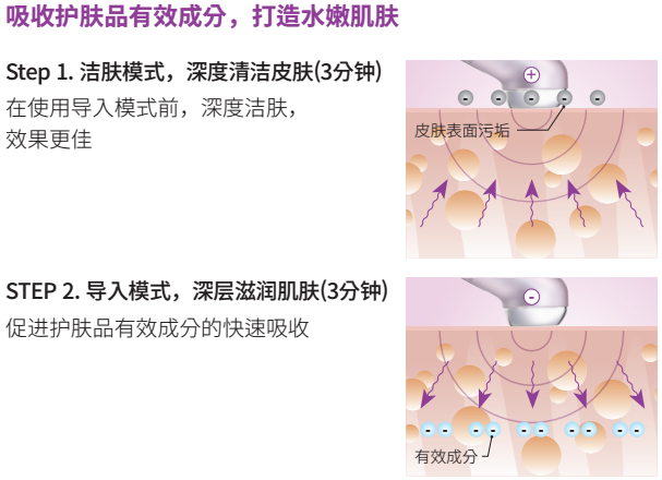 导入功能:过去涂抹上护肤品,感觉半天也不吸收,尤其是夏天,再贵的护肤品涂在脸上也感觉都浮在脸上。而这款仪器能让护肤品快速吸收,离子导入技术将护肤产品的活性成分送入皮肤深层。