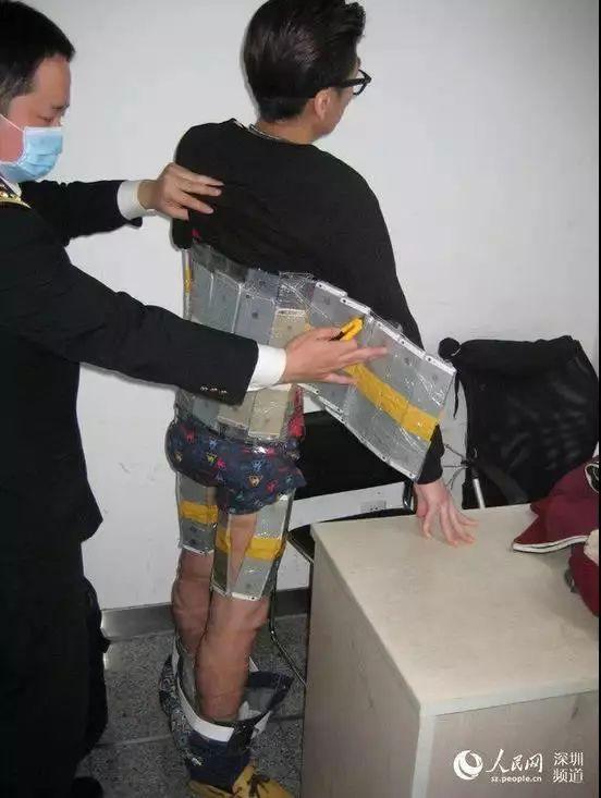 检查发现,该旅客胸部、腹部、跨部、大腿、小腿上缠裹着大量的苹果手机,以人身绑藏方式*私走**苹果手机94部。