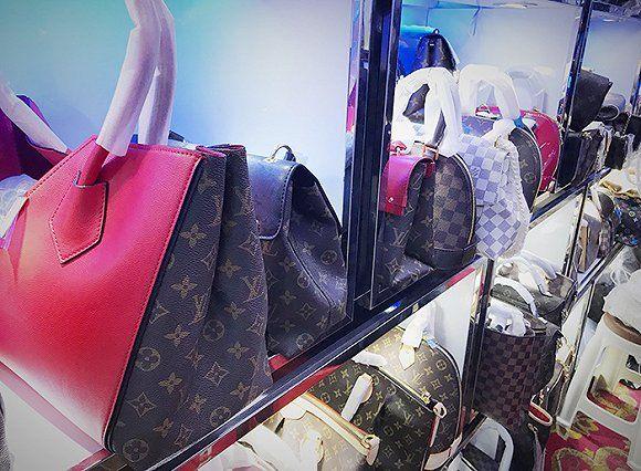 (店内摆着各式仿冒的奢饰品包,最仿真的版本放在VIP室里。摄影:袁浔杰)