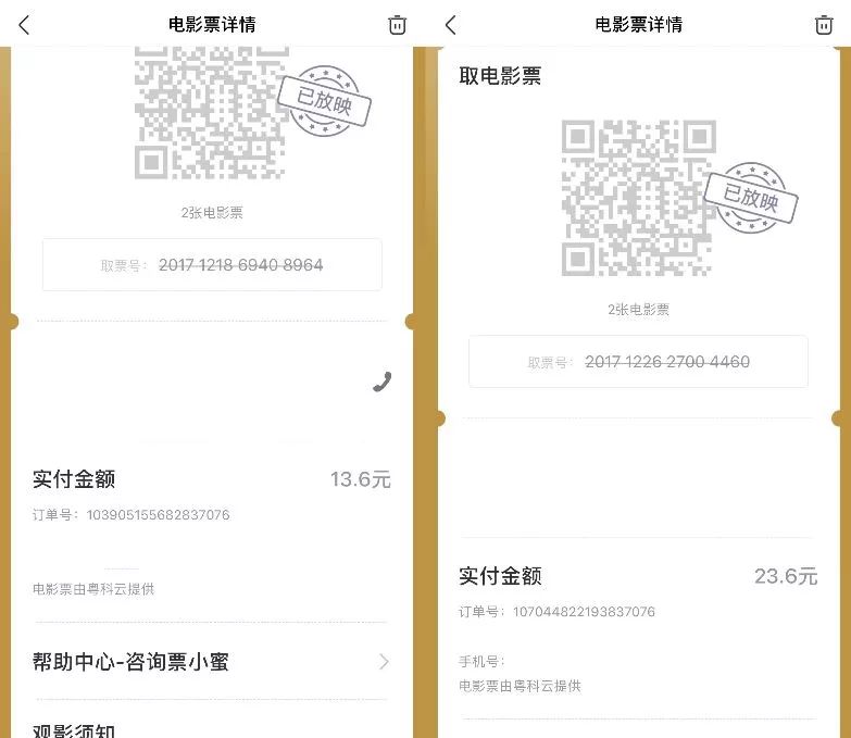 一种是猫眼或者淘票票提前1-2周预订快上映的电影,经常有9.9,19.9的特惠购票福利,一个账户可以买2张票。比如下图是我之前买的电影票,都是2张的,价格分别是14元和24元,很便宜。