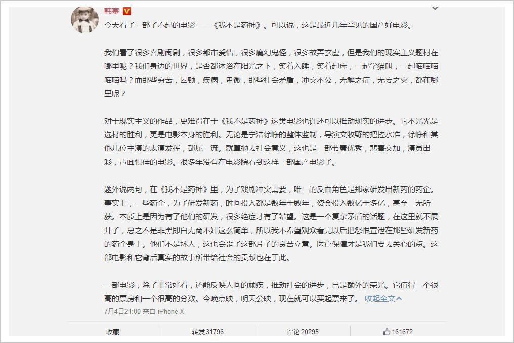 7月4日,在看完《我不是药神》点映场后,韩寒发表了一篇微博,称“很多年没有在电影院看到这样一部国产电影了”,该微博随即迅速登上了“日榜第一”。