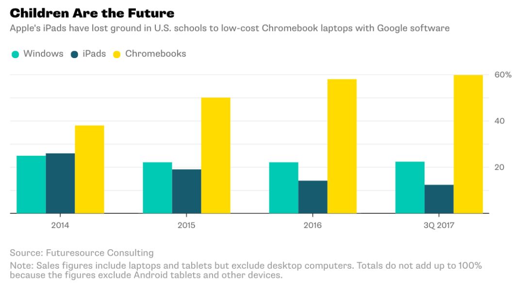 根据未来资源咨询公司(FutureSource Consulting)的数据,2017年第三季度,Chromebook的出货量在美国K-12学校(高中12年级)的笔记本电脑、平板电脑和其他移动电脑中占60%的份额,而苹果公司的iPad仅占学校电脑设备的12%,不到2014年市场份额的一半。学校的预算未必很高,但是科技公司已经把校园变成了激烈角逐的战场,以建立未来科技产品买家的忠诚度。